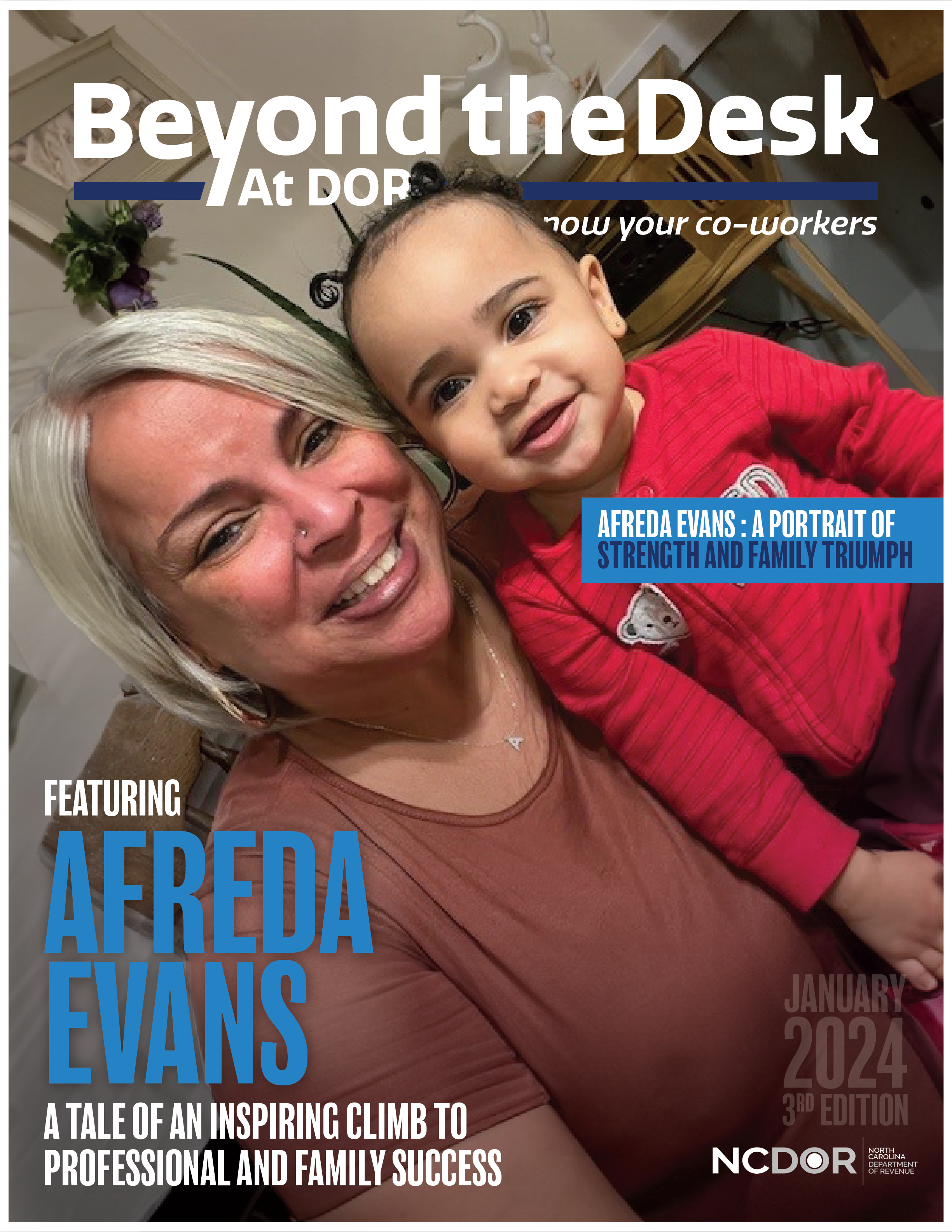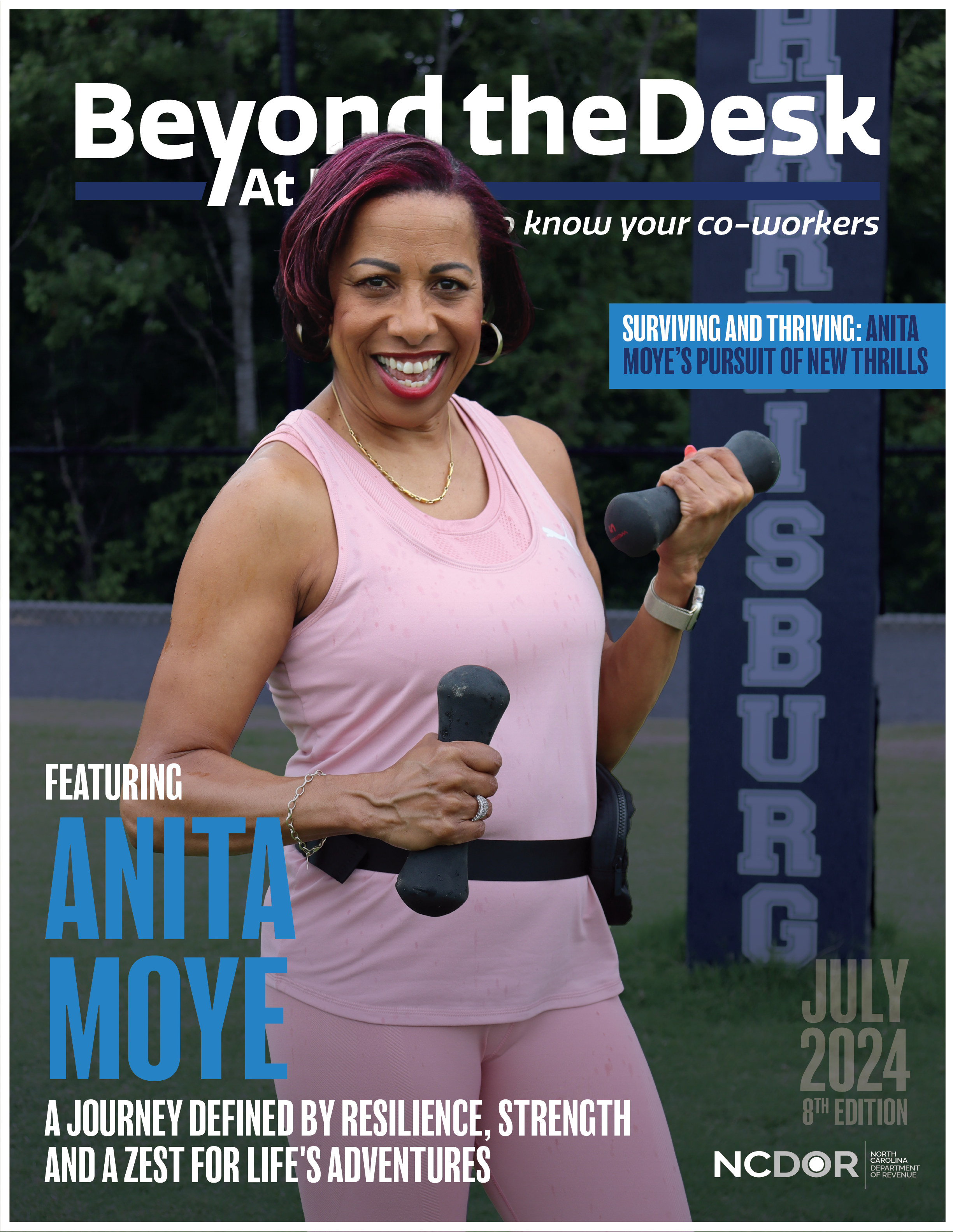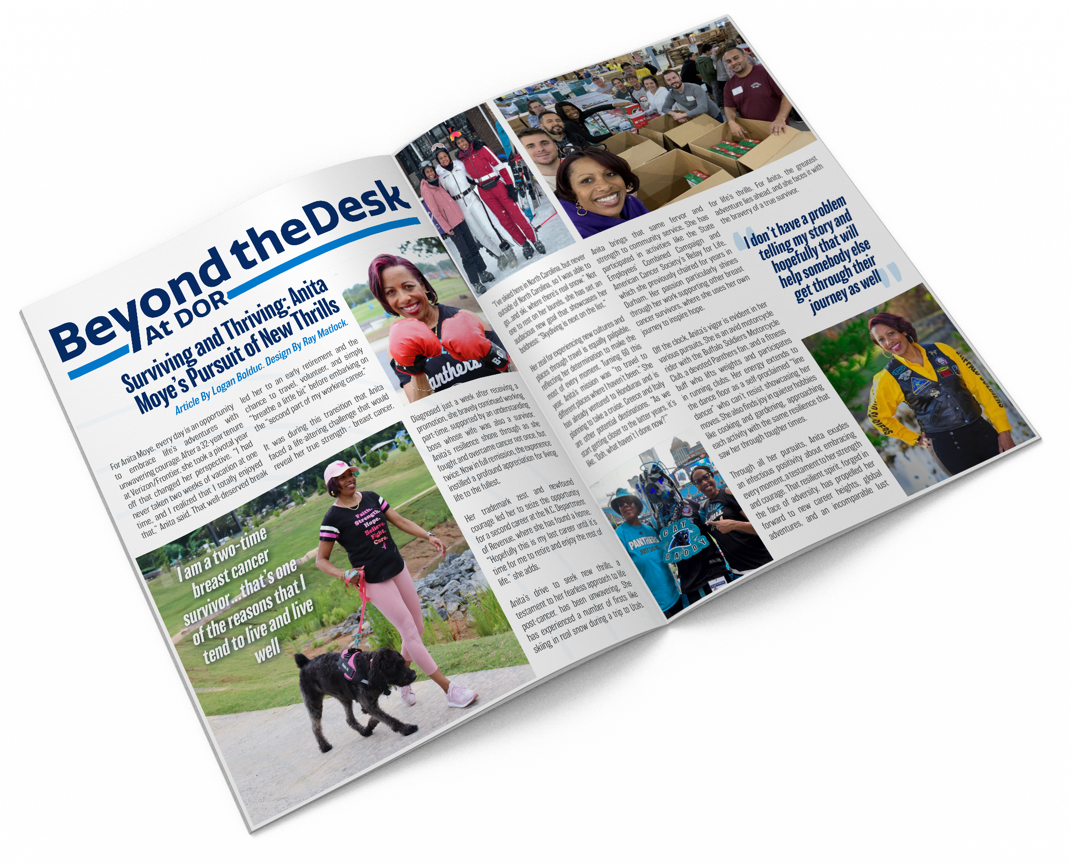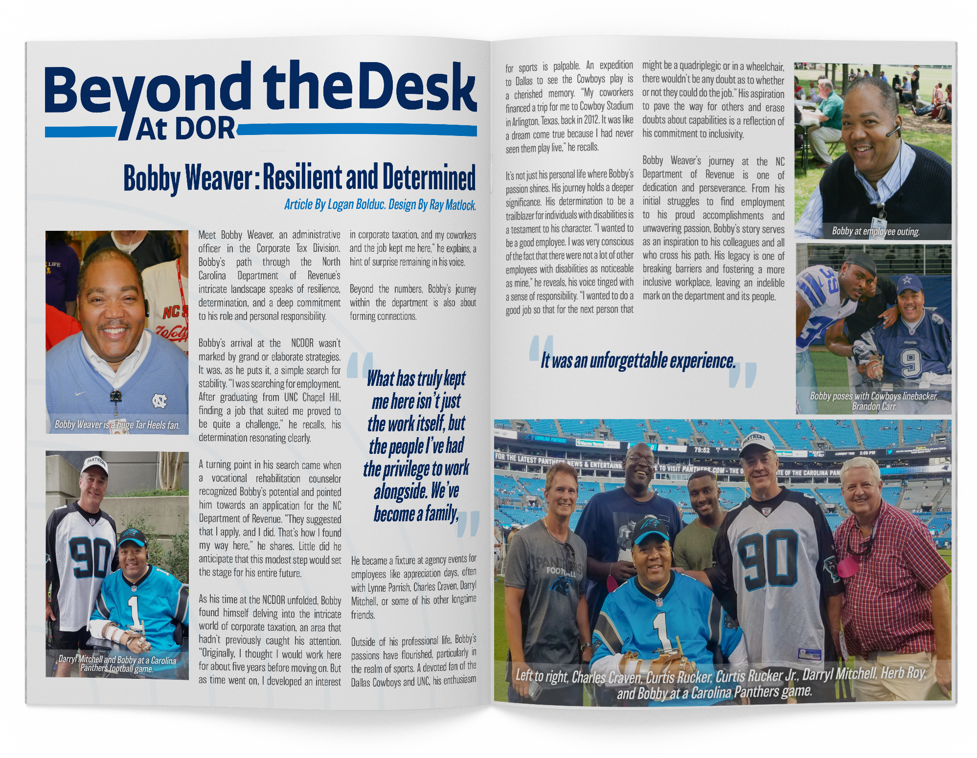 During my time at the North Carolina Department of Revenue , I worked with the Public Affairs team to design and layout a recurring article called "Beyond the Desk." This series highlights employees' unique passions, talents, and lives outside of work. My designs aim to reflect the individuality of each featured person while maintaining a cohesive and professional presentation.